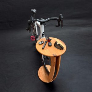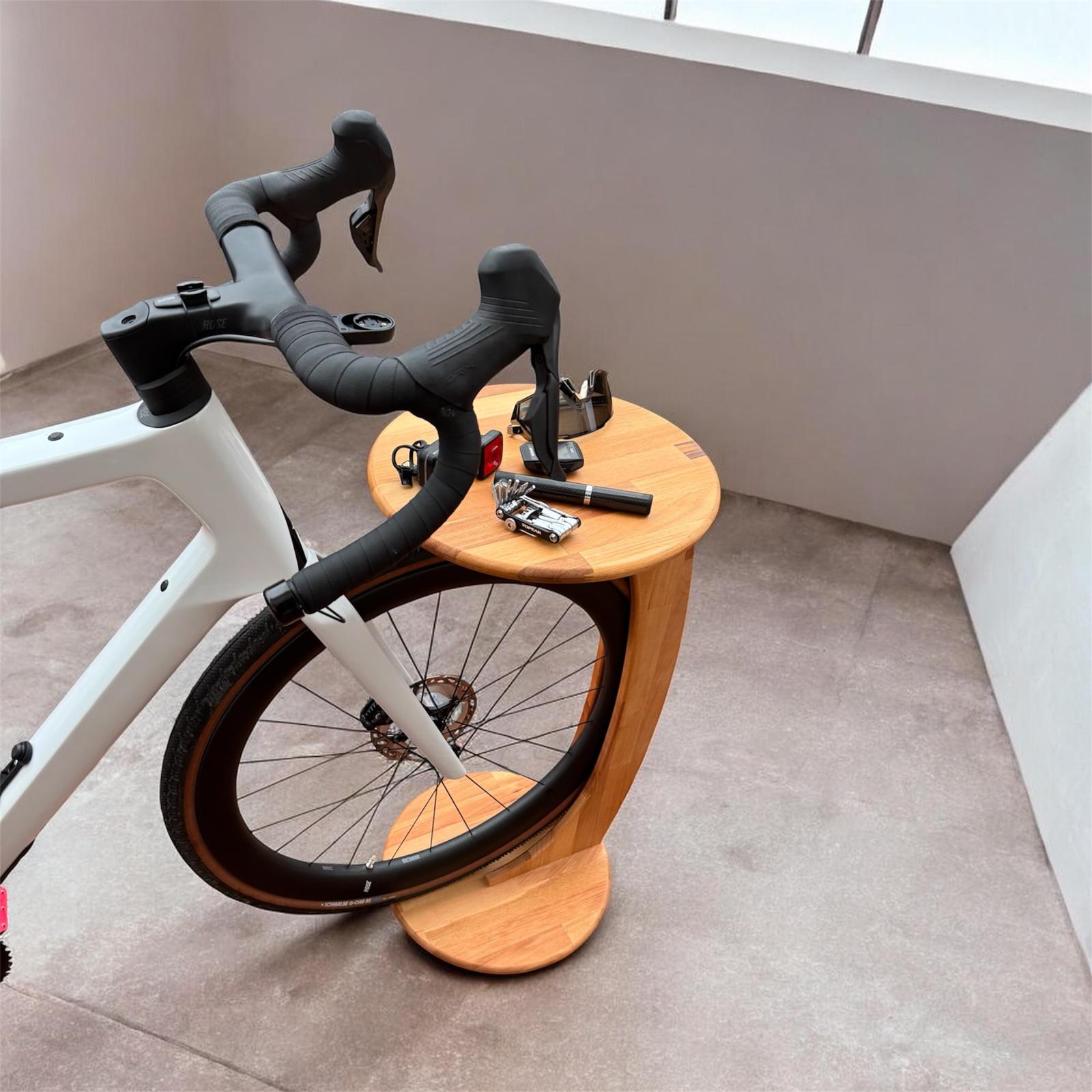 Buchenholz massiv Fahrrad Beistelltisch C-Form runder Beistelltisch für Fahrräder geölt